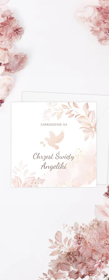 - Zaproszenie z motywem gołębia – symbolizującego Ducha Świętego, który zstępuje na dziecko podczas chrztu