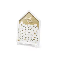 oraz 50 białych serc do wypisania przez gości. Naturalne drewno i elegancki, biały napis nadają