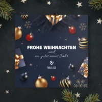 Kartka świąteczna w eleganckiej granatowej tonacji ze złotymi dodatkami to propozycja dla firm, które cenią prestiż i wyjątkowy styl.