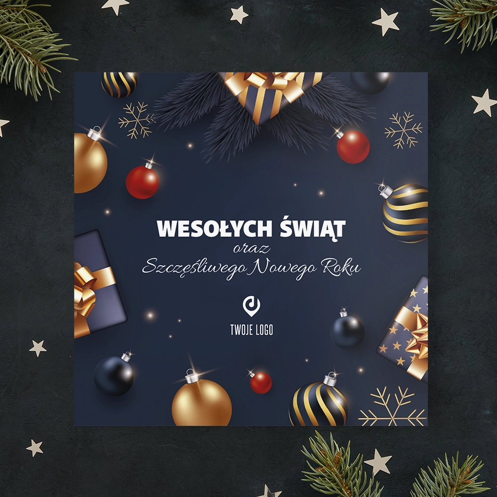 Motyw prezentów i bombek nadaje projektowi świątecznego charakteru, jednocześnie podkreślając profesjonalny wizerunek marki.