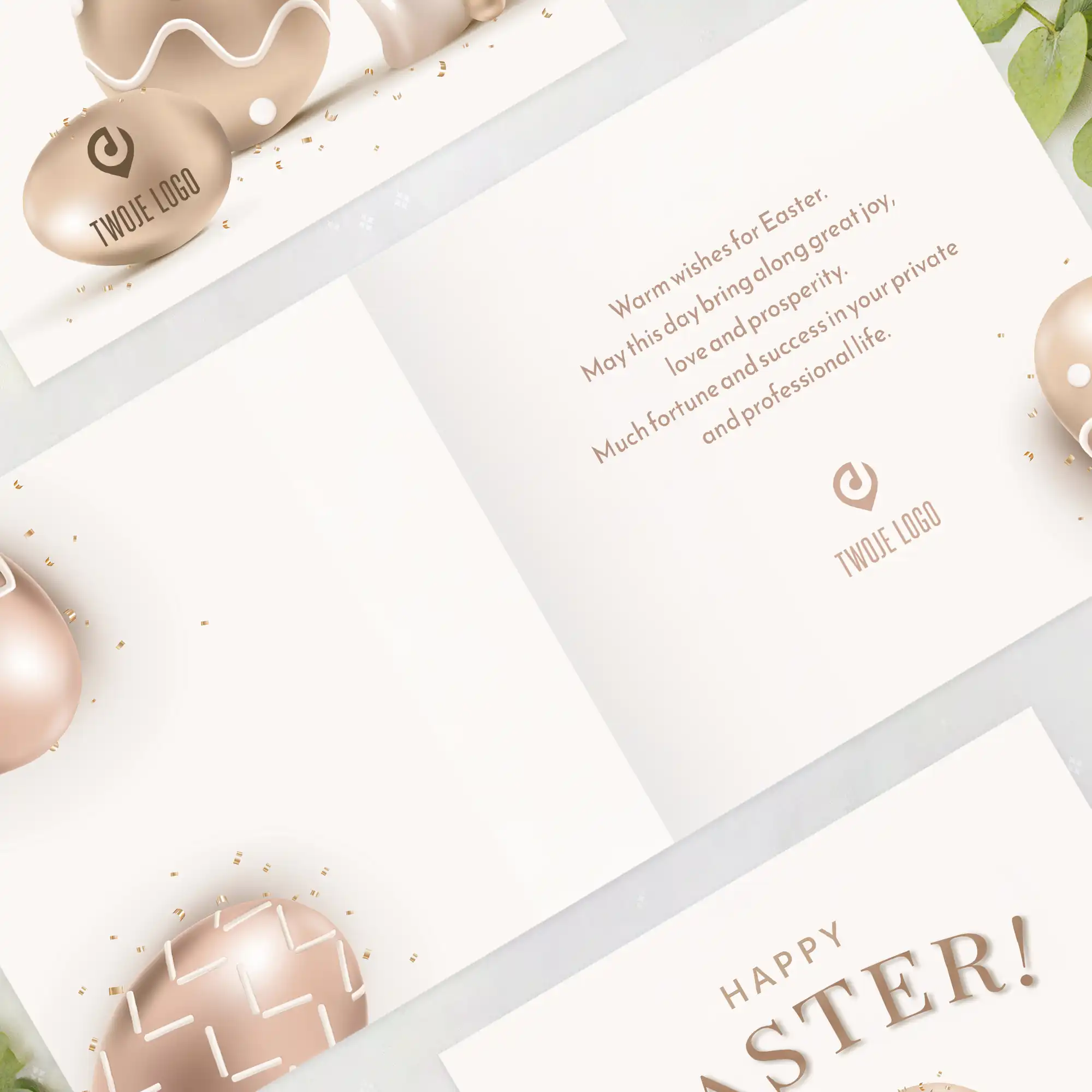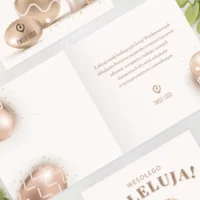 Projekt uwzględnia miejsce na logo Twojej firmy. W środku znajdują się wyjątkowe życzenia,