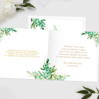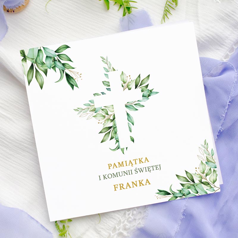 Motyw przewodni zaproszenia stanowi biały krzyż otoczony zielonymi listkami.