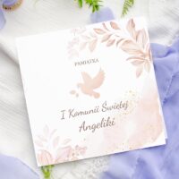 Kartka na komunię z życzeniami RÓŻOWY GOŁĄBEK z imieniem dziecka