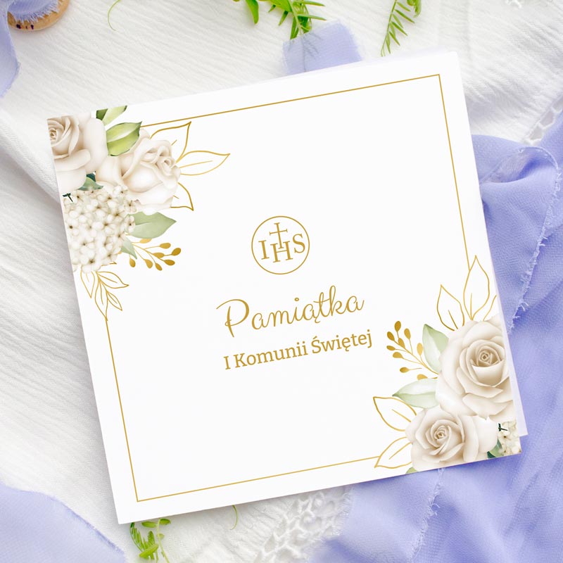 Kartka pamiątka komunii BIAŁE RÓŻE z życzeniami