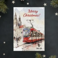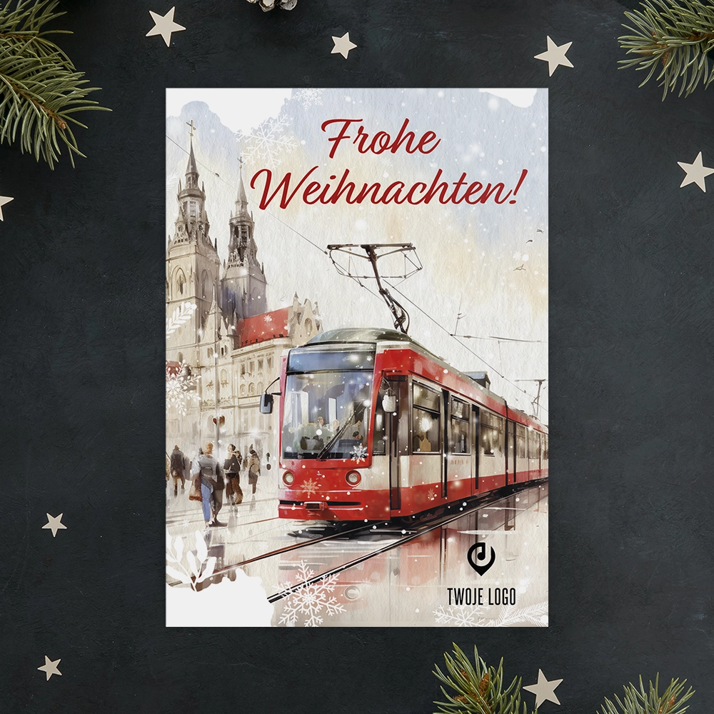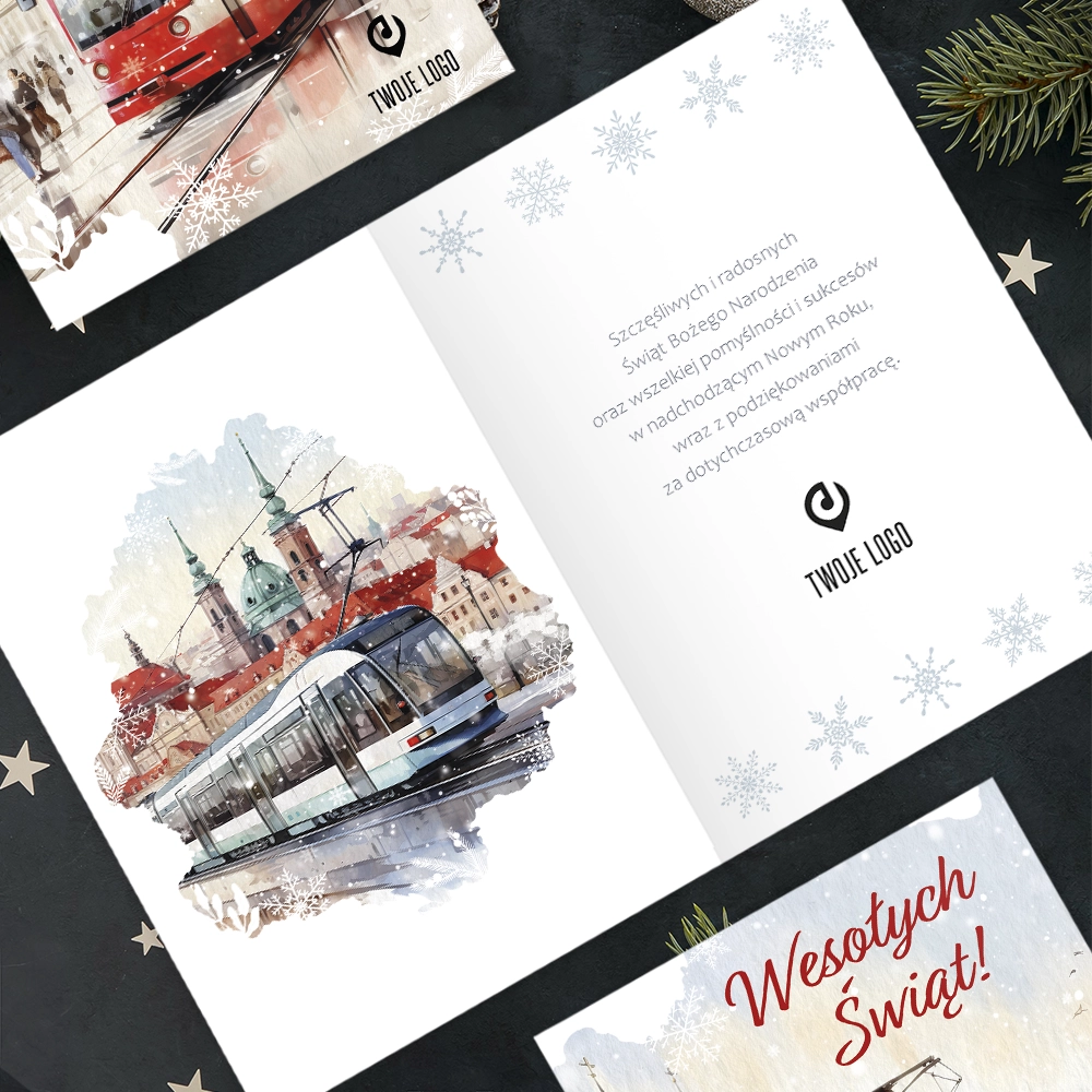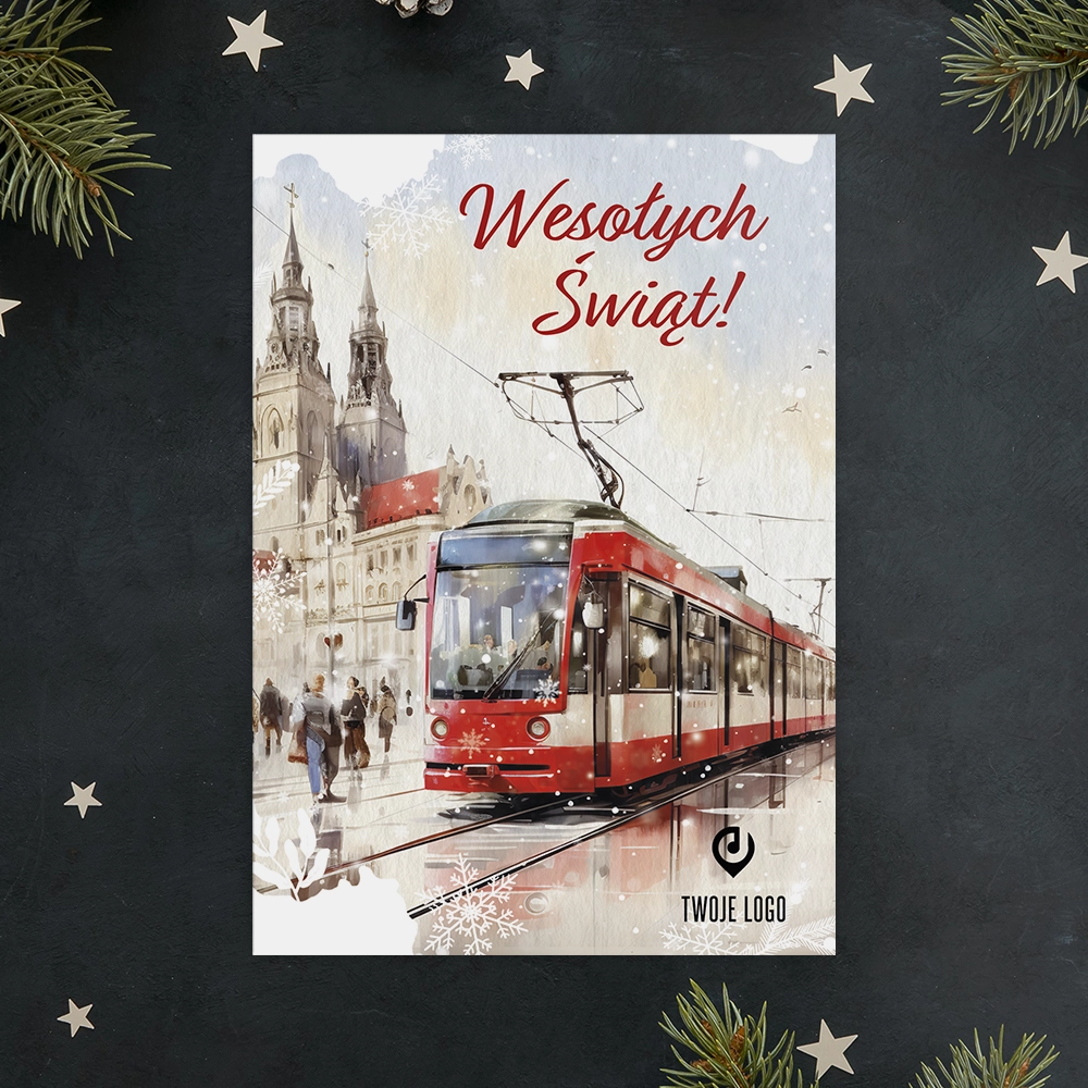 Kartka świąteczna ŚNIEŻNY TRAMWAJ z Twoim logo