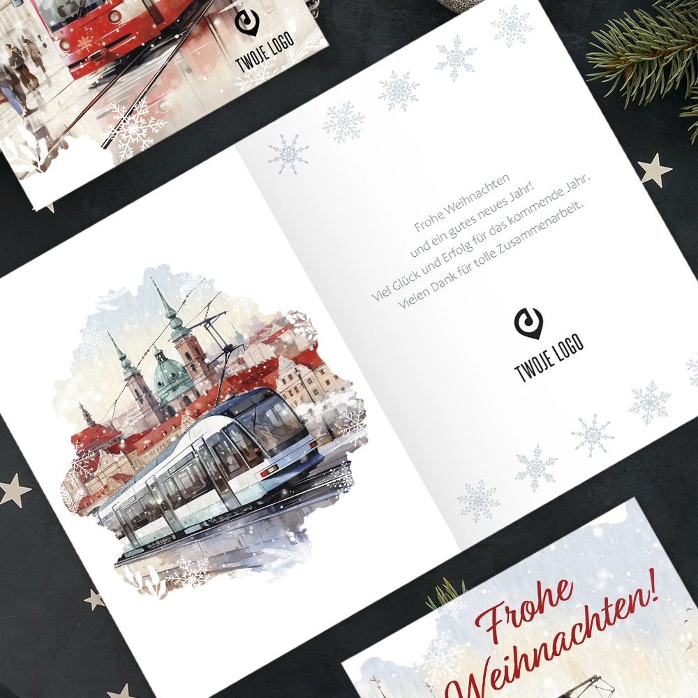 • Kartki świąteczne firmowe z logo ŚNIEŻNY TRAMWAJ