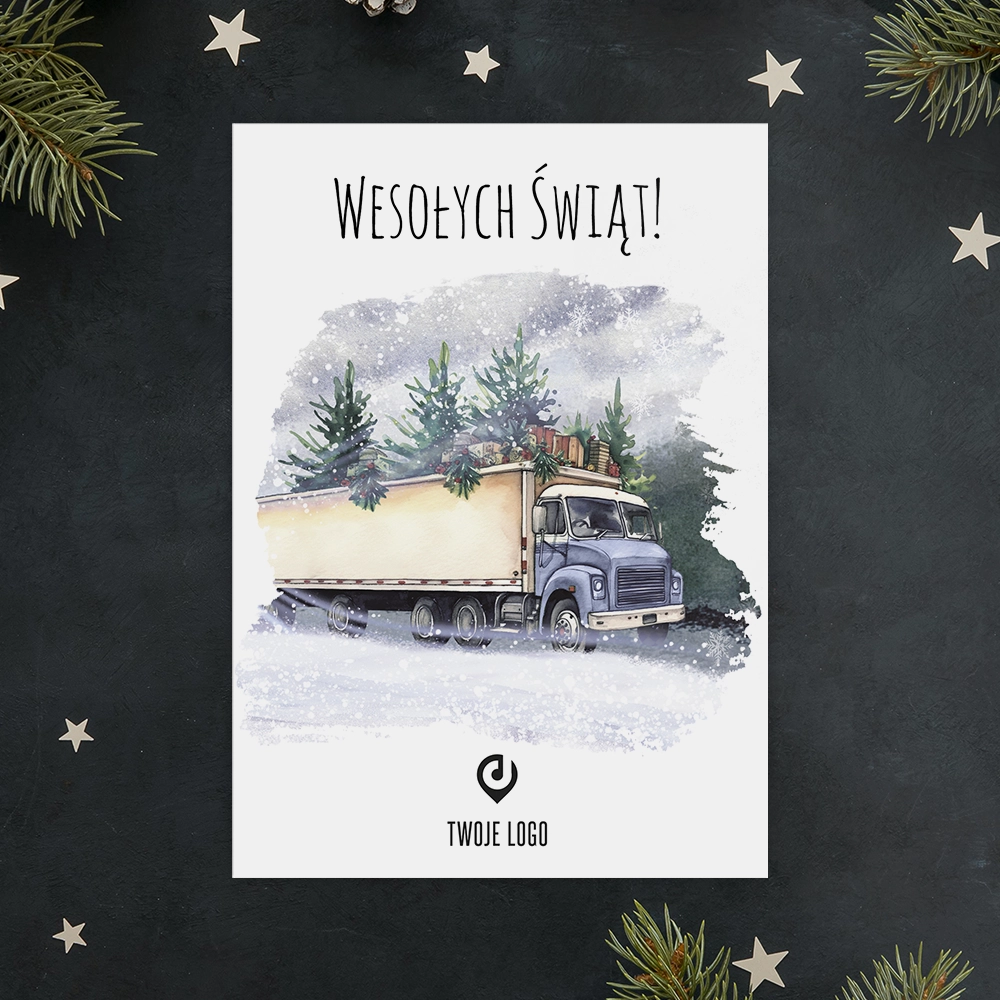 kolorowej ciężarówki przewożącej świąteczne prezenty, wprowadza ciepło i zabawę do świątecznych życzeń.