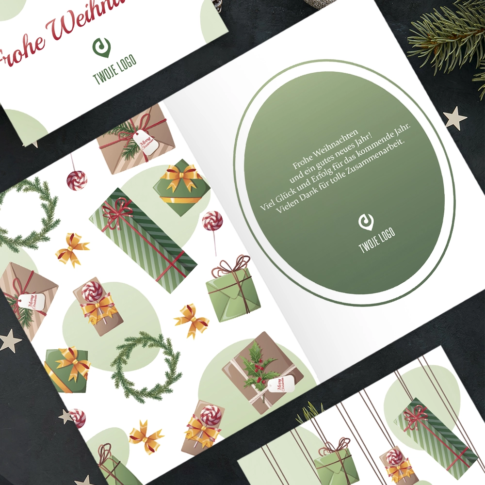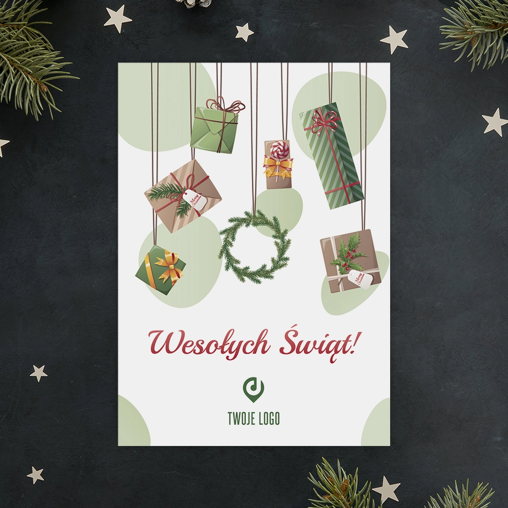 Kartka świąteczna WISZĄCE PREZENTY z Twoim logo