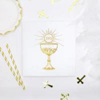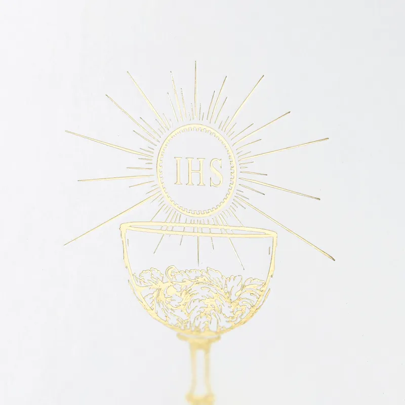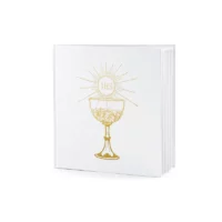 perłowym papierem w kolorze białym, ze złotym kielichem na okładce. Ta elegancka