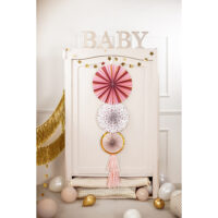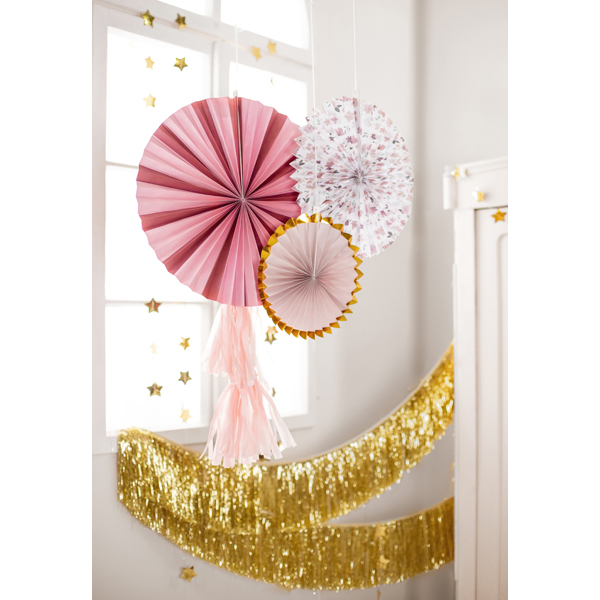 Śliczne rozety dekoracyjne wykonane z papieru z frędzlem w kolorze jasno różowym, z metalizowanymi zdobieniami. Sprawdzą się na przyjęciach o różnych tematykach. Może to być impreza na walentynkowa, wielkanocna, karnawałowa, urodzinowa, baby shower czy sylwester. Rozety są dekoracją prostą do złożenia i umieszczenia w dowolnym miejscu. W połączeniu z balonami oraz innymi dekoracjami możesz stworzyć aranżację, którą Twoi goście zapamiętają na długo!