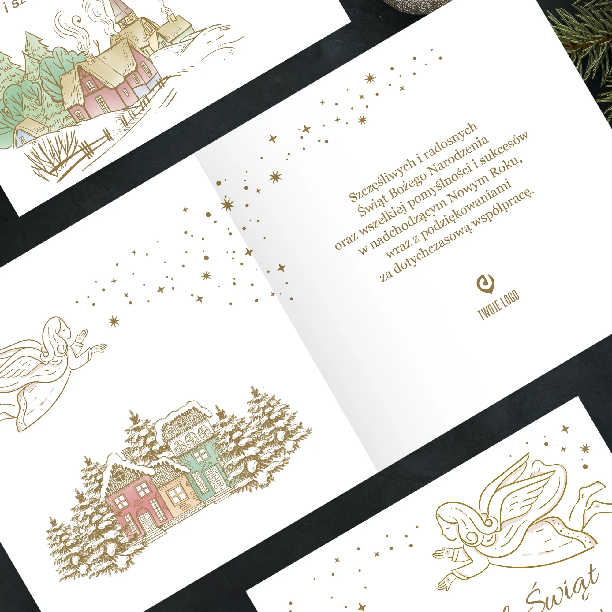 okładki i życzeń w języku polskim, angielskim lub niemieckim. Każda świąteczna kartki z logo dla firm przygotowywana jest