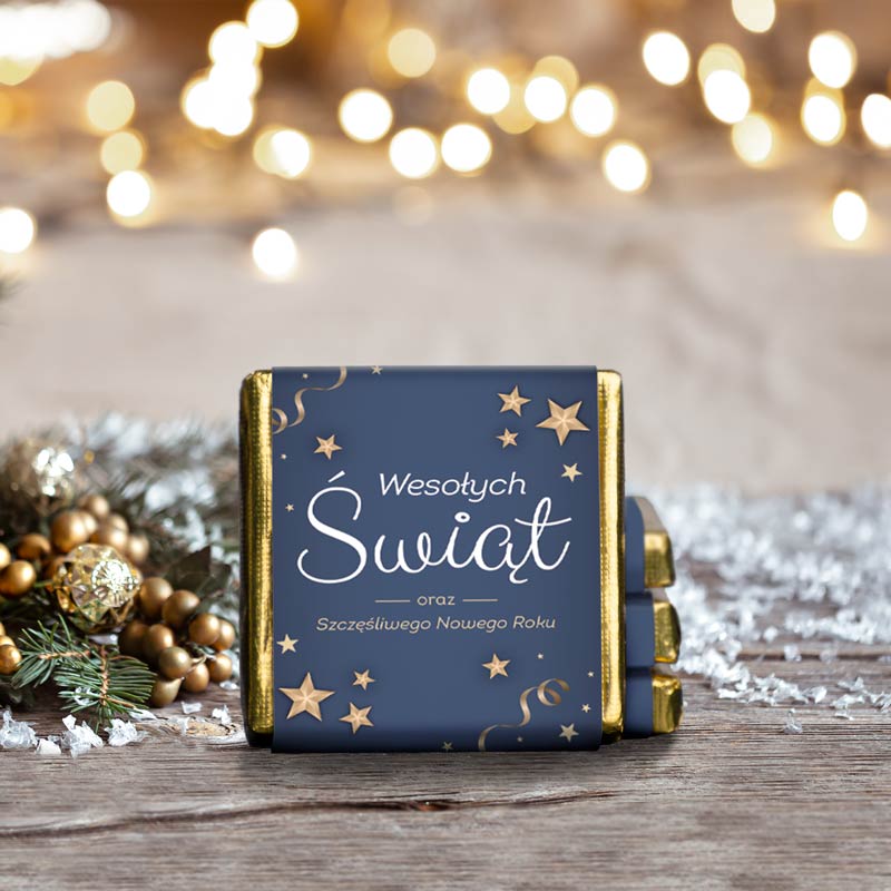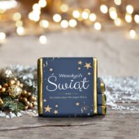 Świąteczne czekoladki z logo dla firm projektowane są w duchu magicznej wigilijnej atmosfery.