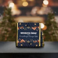 Świąteczne czekoladki z logo dla firm projektowane są w duchu magicznej wigilijnej atmosfery.
