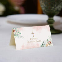 Eleganckie wizytówki, które idealnie pasują na przyjęcie komunijne dla dziewczynki.